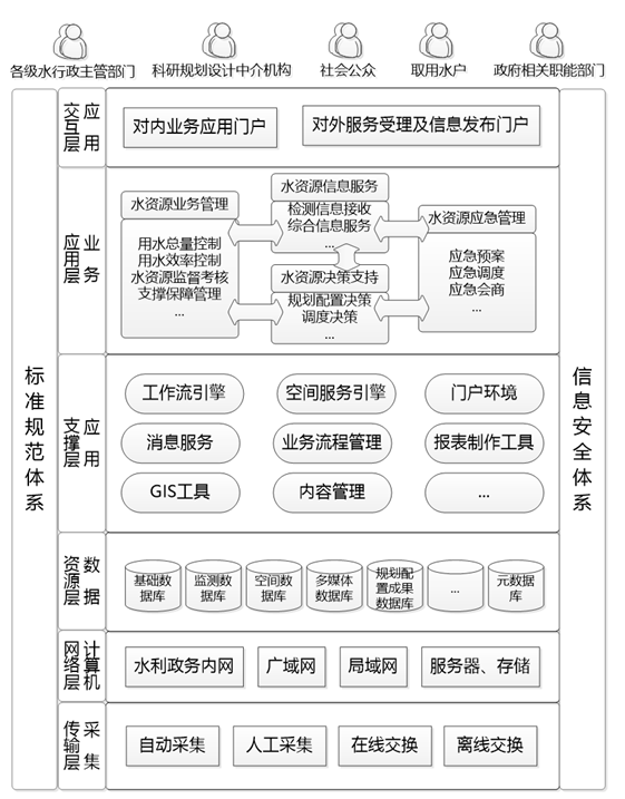 水资源管理信息平台主要是在现有信息化基础设施基础上,充分利用信息化技术,以水资源的水源、取水、用水等水资源开发利用主要环节的水资源信息监测为基础设施,利用水利骨干网、政府电子政务网、Internet公网,构建水资源管理业务办公网络和信息实时监测网络,建设水资源信息服务系统、水资源业务管理系统、水资源调配决策支持系统、水资源应急管理系统、水资源门户系统,形成水资源管理与监理信息资源中心,重点监测辖区内水源、取水、用水以及河流市县际控制断面、地下水等信息,建立水资源宏观调控和水资源调配体系,对水资源开发利用动态进行有效监控,及时分析掌握水资源开发利用现状,科学调控和优化配置,改善管理手段、提高管理能力,为实现对水资源的合理开发、高效利用、优化配置、科学管理、全面节约、有效保护和综合治理,有助于传统水利向现代水利、可持续开展水利转变,以“用水总量控制、水功能区限制纳污控制、用水效率控制” 实行最严格的水资源管理制度,以水资源的可持续利用支撑经济社会的可持续开展,给予信息服务和业务管理技术支持,为最严格水资源管理制度实施给予技术支撑。