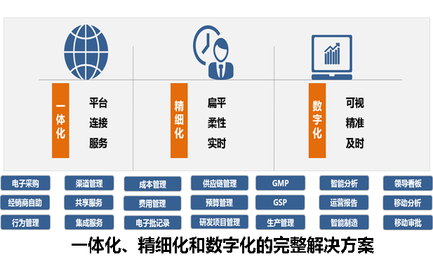 在“互联网+”、“大数据”以及“云计算”的时代背景下,不断融合新的技术和新的管理理念,紧跟企业“数字化”转型潮流,为医药企业给予一体化、精细化和数字化的完整解决方案。